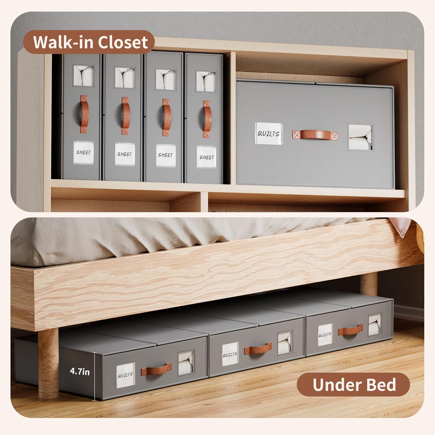 Upgrade your storage game with the EE-RoomWorld Bed Comforter Organizer! Crafted from stylish, durable fabric with chic patterns, this organizer replaces flimsy non-woven materials for long-lasting use. Reinforced leather handles ensure strength and ease of carrying, while high-quality corrugated plastic panels resist moisture, keeping your linens safe and fresh. Each bag can store 1 king/queen-size comforter, 4 duvet covers, or 4 sheets, helping you declutter and maximize closet space. When not in use, it folds down to just 1" thick for compact storage. The transparent window lets you quickly identify contents, and the removable label makes organization a breeze. Measuring 21"L × 18"W × 11"H, it’s perfect for bedrooms, closets, apartments, and dorms—turning your storage into a sleek, aesthetic solution!