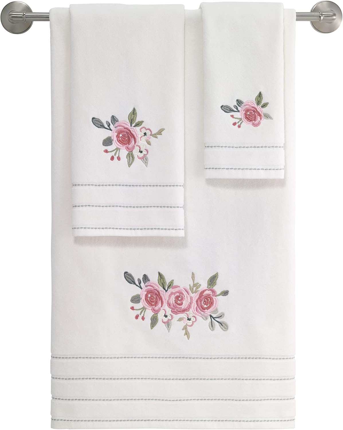 The Avanti Spring Garden Collection 3-Piece Towel Set is decorated with embroidered peonies in pink with green leaves and woven, yarn-dyed green border stripes on an ivory ground. Made of soft and absorbent 100% ringspun cotton. Set includes 1 each of bath, hand and fingertip towels.