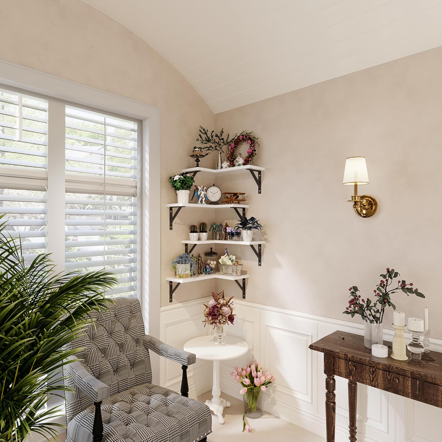 levate the organization and style of your living space with our Corner Shelf Wall Mounted set. This set includes 4 white corner floating shelves that are designed to make the most of those often overlooked corner areas in your home. Crafted with precision, each shelf features a smooth white finish that effortlessly blends with any interior color scheme. The clean lines and modern aesthetic add a touch of sophistication to your room, whether it's a contemporary living room, a cozy bedroom, or a busy kitchen. Made from high-quality and durable materials, these shelves are built to support a wide range of items. From lightweight decorative pieces like photo frames and small plants to heavier objects such as books and kitchenware, you can trust these shelves to hold your belongings securely. Installation is a straightforward process, thanks to the included wall mounting hardware and step-by-step instructions. You'll be able to transform your empty corners into functional and stylish storage spaces in no time. The wall-mounted design not only saves floor space but also gives the illusion of a more open and organized room. With their versatility, these corner shelves can be used to display your cherished mementos, keep your frequently used items within arm's reach, or simply add a decorative element to your walls. They are the perfect solution for decluttering and enhancing the visual appeal of any room in your house.