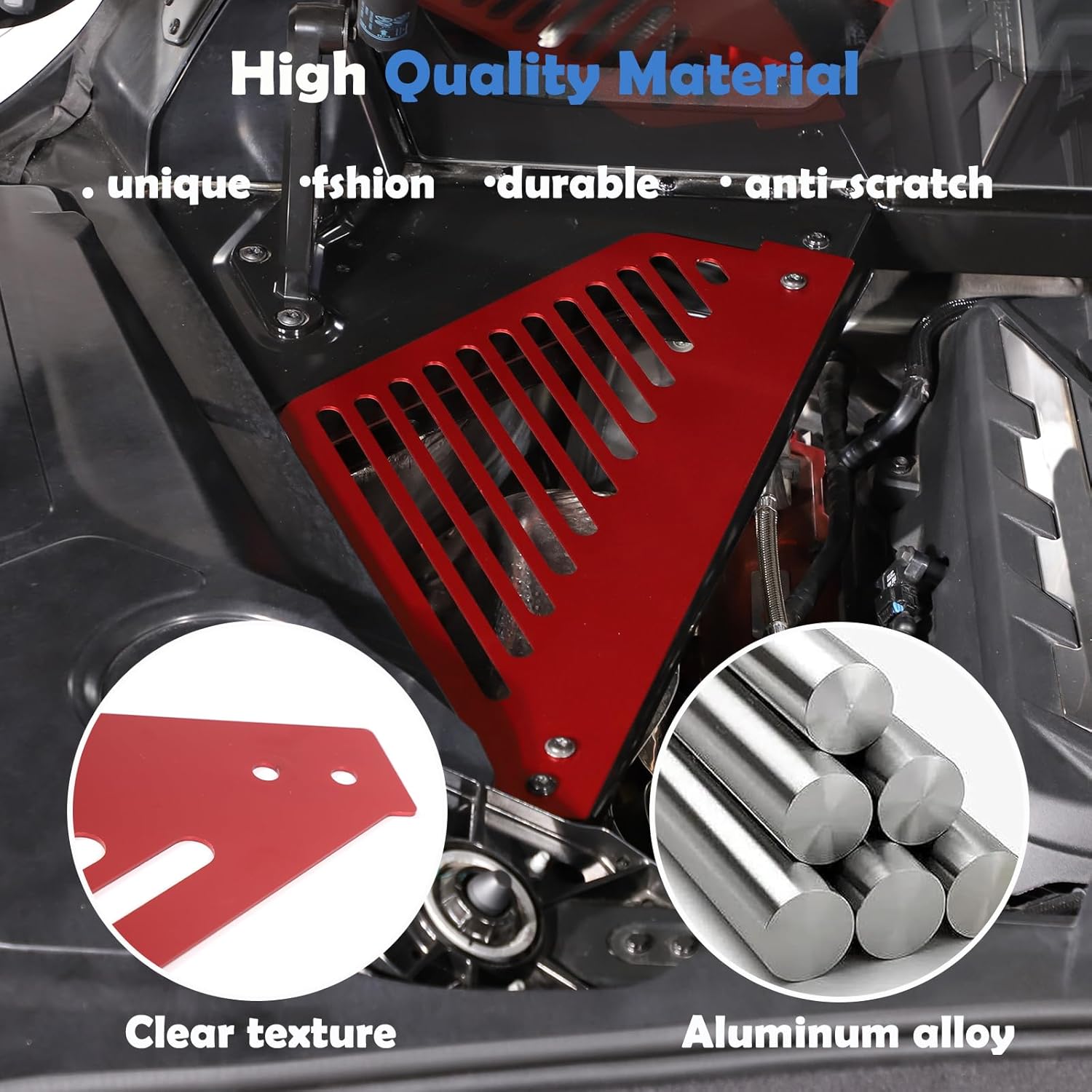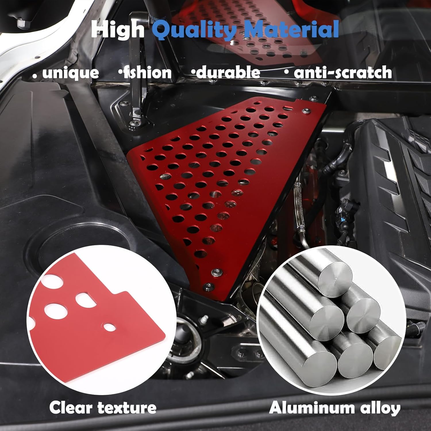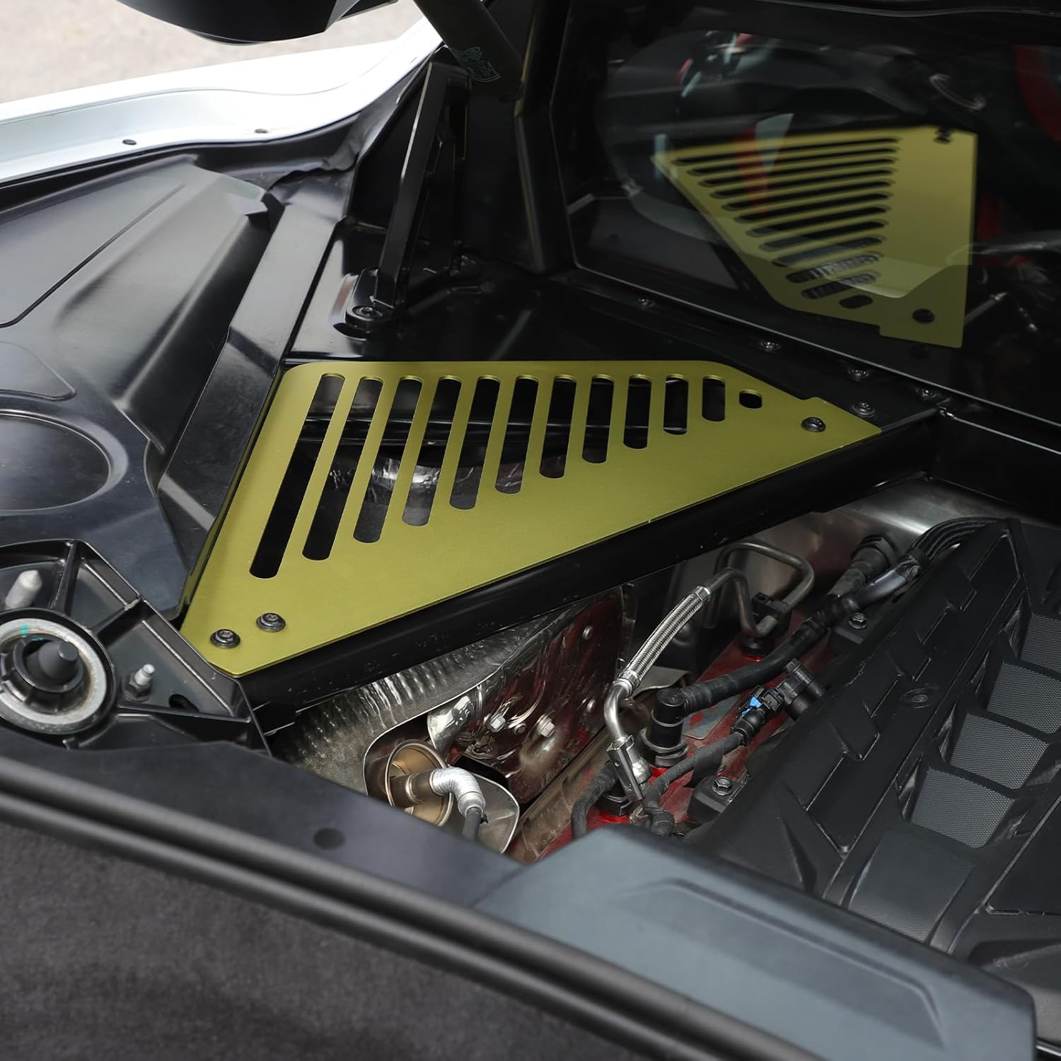 Fitment :Engine Compartment Left Right Engine Case Guard Compatible with 2020-2023 Corvette C8(DO NOT FIT HTC) 100 % Brand New Condition Engine Bay Left Right Panel Feature : NO edges, NO cut hands High hardness, perfect cut Cooling vents, efficient heat dissipation Package : 2 Pieces Cover (Left & Right ) EASY INSTALLATION:Just fix the cover with bolts, NO need special tools. Installed in minutes. Material: Made of aluminum alloy material This aluminum alloy engine protection cover hardness, corrosion and scratch resistance, unique streamlined design ventilation vents, The unique design can transfer heat away from the vents, and at the same time, it is easy to check the oil tank reserve without disassembly. Why Choose Our Product?100% Brand New! Easy and quick installation even for beginners. This product is manufactured in the original version of the original car 1:1,perfect fit in without gap360 degree baking finish with smooth surface and luxury high end look