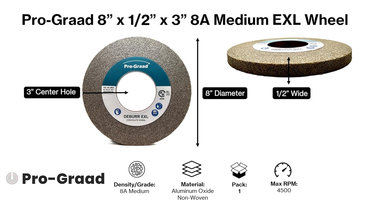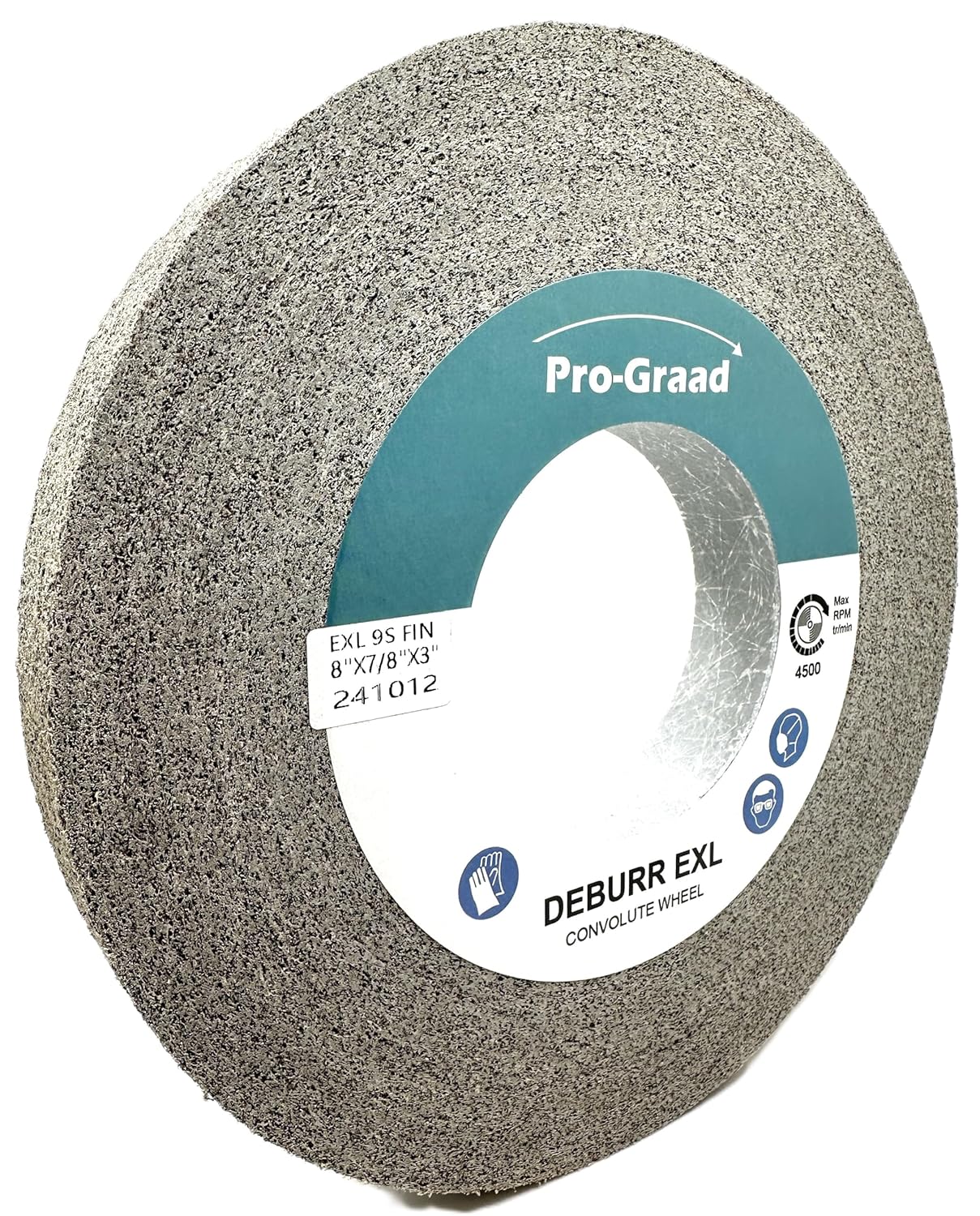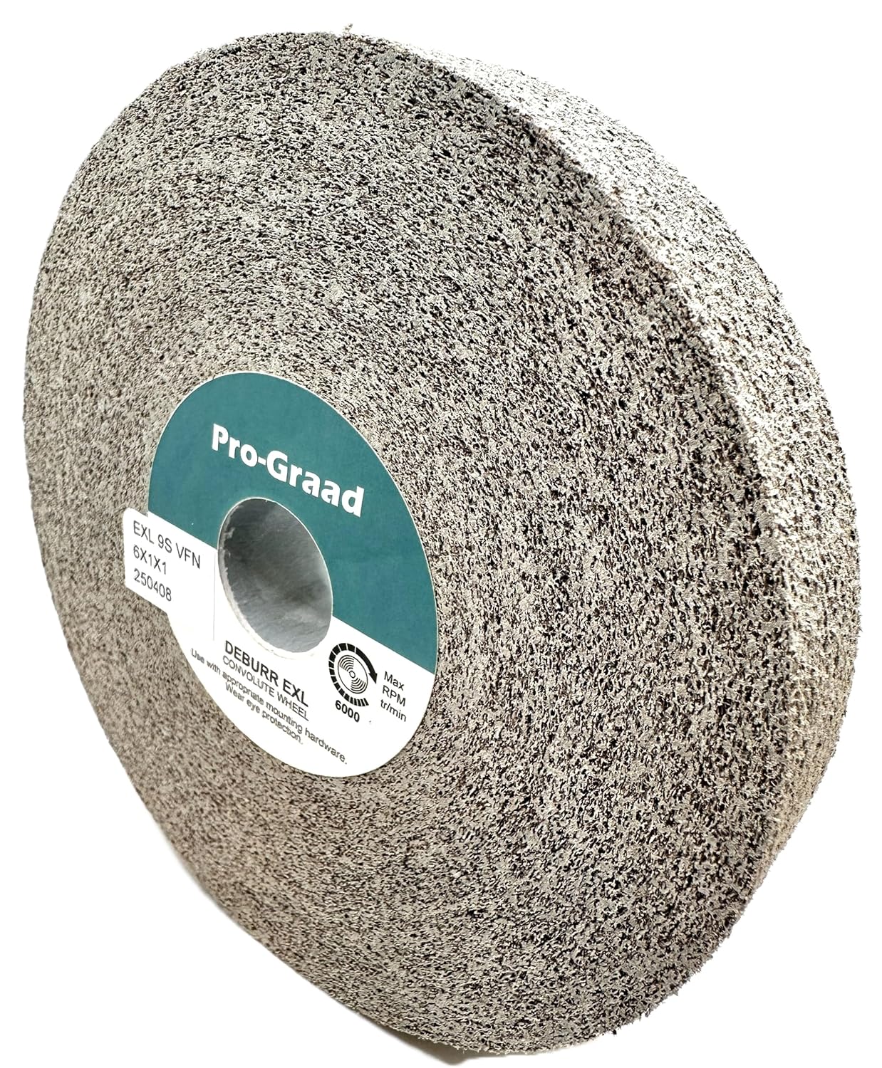 Pro-Graad EXL Convolute Deburring Wheel – Precision, Performance, and Durability. Elevate your projects with the Pro-Graad EXL Convolute Deburring Wheel, engineered to deliver professional-grade results for precision deburring, blending, finishing, polishing, and cleaning. Measuring 6" in diameter, 1" wide, with a 1" arbor hole, it comes with a telescoping wheel arbor adapter for seamless compatibility with 1/2", 5/8", and 3/4" shafts. Crafted with Fine grade Silicon Carbide, this wheel features a 9-density convolute wound design on a durable 1" core. It ensures a smooth, flawless finish without compromising the integrity of your workpiece. The versatile wheel is ideal for various materials, including metals, composites, and glass, making it perfect for industries such as metalworking, hardware, medical instruments, fabrication, and plumbing fixtures. Designed for wet and dry applications, it maintains consistent contact even on complex shapes, ensuring reliable performance and uniform finishes. Its resin bonding formulation minimizes smearing and heat buildup, reducing the risk of discoloration or warping on heat-sensitive materials. Pro-Graad products exceed ANSI and EU standards and are backed by a 100% Product Guarantee—if you're unsatisfied, return it within 30 days for a replacement or refund. As a USA-based company, Pro-Graad is committed to delivering high-quality, high-performing products. Enhance your equipment with the Pro-Graad EXL Deburring Wheel—the reliable solution for precision, durability, and exceptional performance.