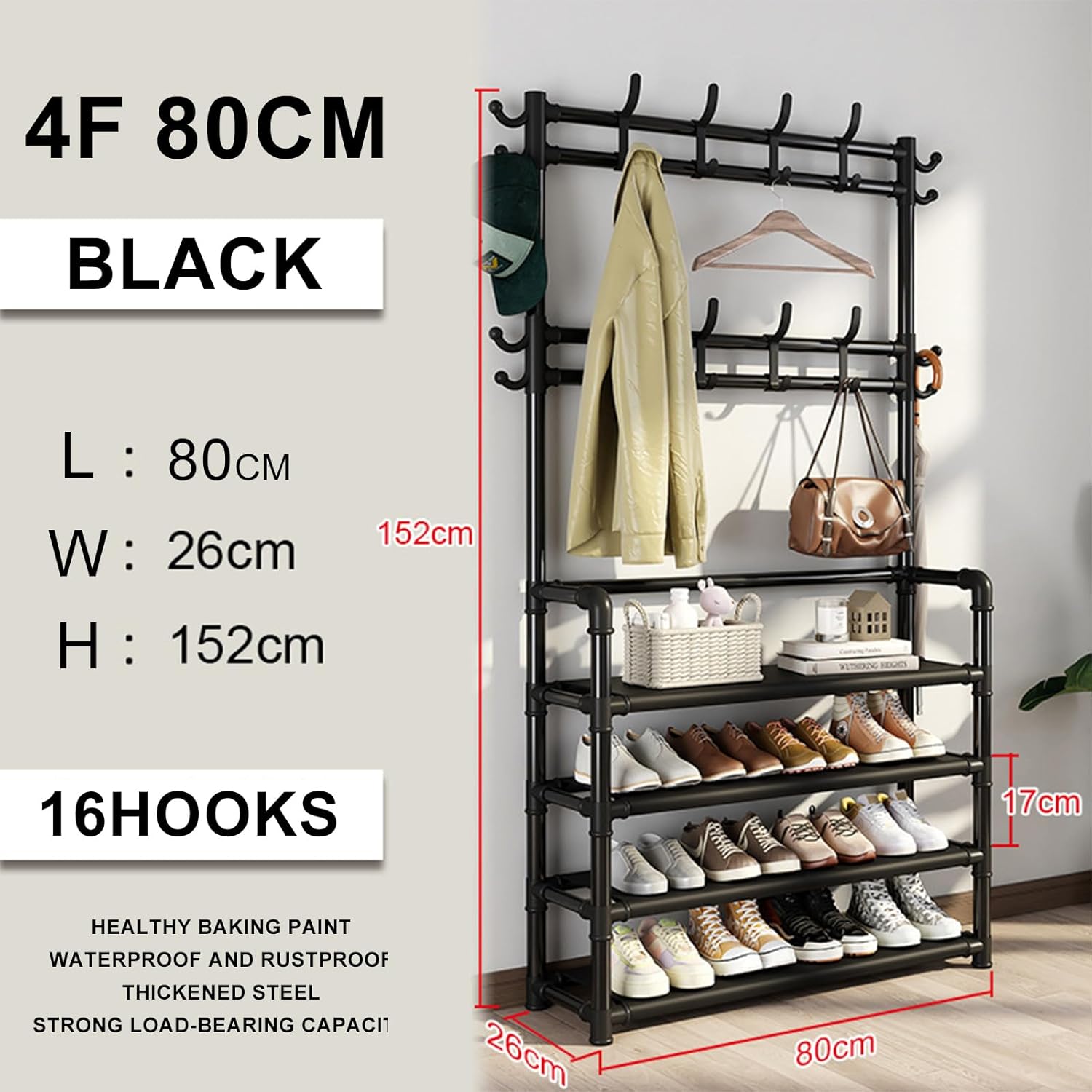 Full Length Mirror with Coat Rack Free Standing Floor Mirrors,Transform your living space with our stylish and functional wrought iron coat and shoe rack. Are you tired of clutter in your entryway or living room? This versatile storage solution offers a perfect spot for your coats, shoes, hats, and bags, providing a tidy and welcoming environment as soon as you step inside. Designed to maximize vertical space, our tall shelf optimizes your home’s layout, making even the smallest areas feel spacious and organized. Whether placed in your hallway, porch, or living area, it seamlessly blends into your decor while enhancing your home's functionality. Our coat and shoe rack features a smart design that combines hanging rods, hooks, and shelves, catering to all your storage needs. Its robust build ensures excellent load-bearing capacity, giving you peace of mind that your belongings are secure. With two elegant color options—black and white—you can easily match this rack to your existing décor. Available in multiple sizes, including 60 x 26 x 152 cm, 60 x 26 x 172 cm, 80 x 26 x 152 cm, and 80 x 26 x 172 cm, it adapts perfectly to your space. Elevate your home organization with this essential storage solution that not only declutters but also adds a touch of elegance to your entryway. Say goodbye to messy spaces and hello to a more organized life!