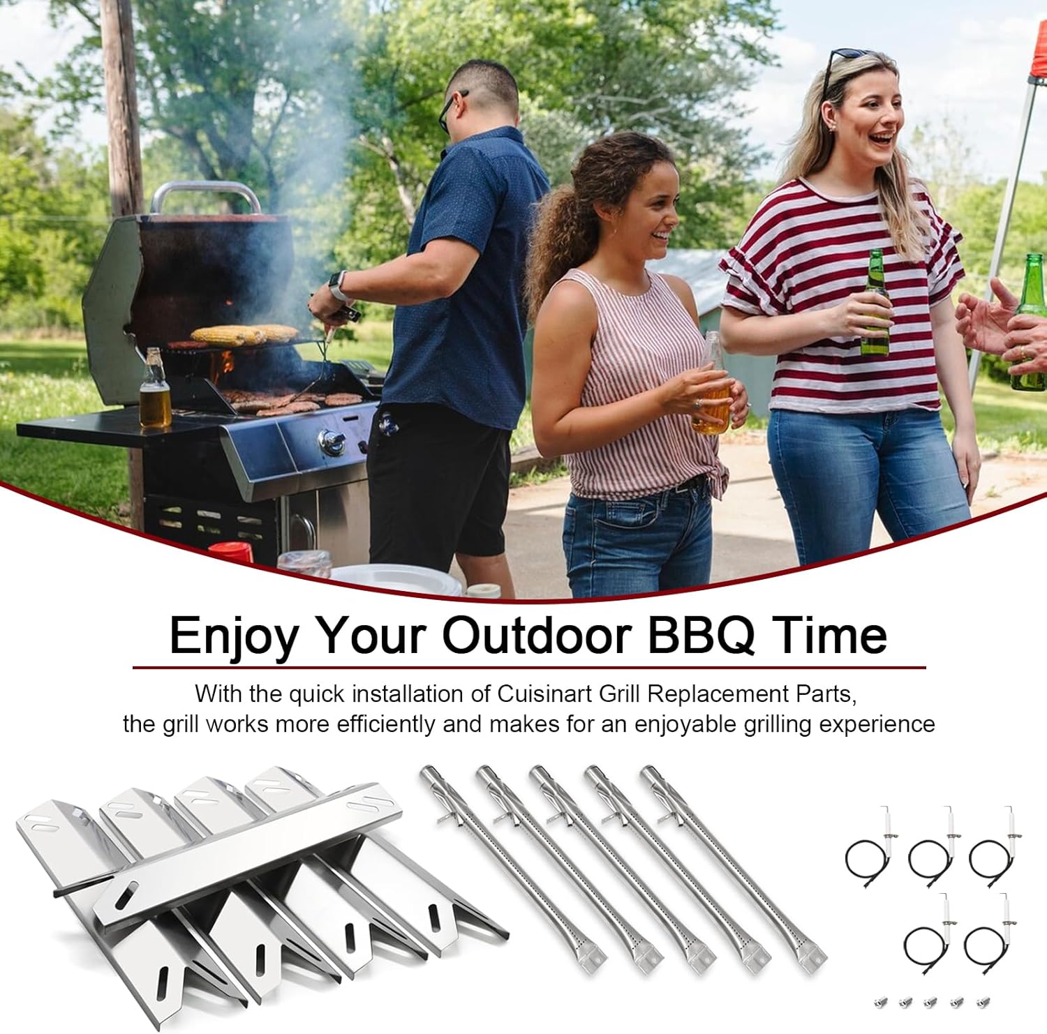 【Specification】 【Compatible Models】 For Cuisinart GAS9556AS GAS9556ASO 5 burner gas grill 【Product packaging】 ★3 x Stainless Steel Grill Grates, Dimension: 17 13/16" x 9 1/16" for each, 17 13/16" x 27 3/16" for total ★5 x Stainless Steel Heat Plates, Dimension: 15 1/2" x 3 1/8" ★5 x Stainless Steel Burner Tubes, Dimension: 15 3/8" x 1" ★5 x Grill Igniters 【Product Features】 High-temperature resistant Durable and long-lasting Does not rust easily Easy to install Easy to clean