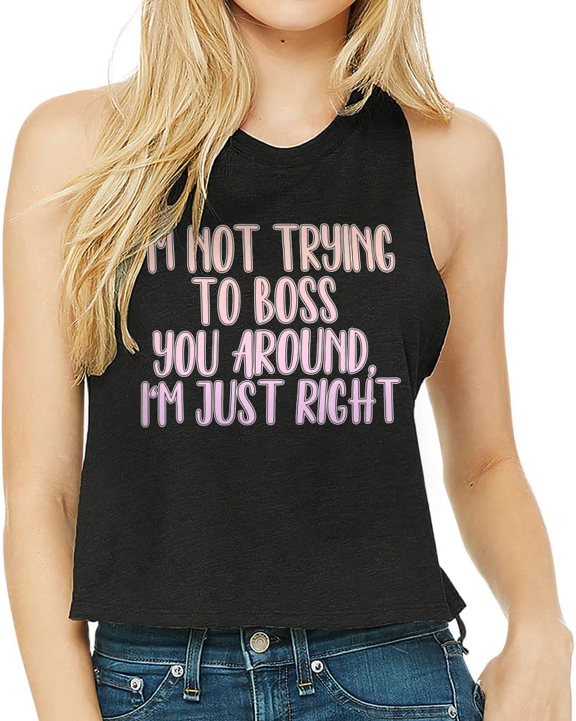 Cute and flattering I'm Just Right Racerback Cropped Tank is suitable for most indoor or outdoor activities, such as gym, yoga, running, hiking, beach or relaxing around the house. Pair Text Design Women's Tank with your favorite sports bras, especially strappy ones, and high-waisted leggings, then you will enjoy cool and comfortable exercise throughout the summer.