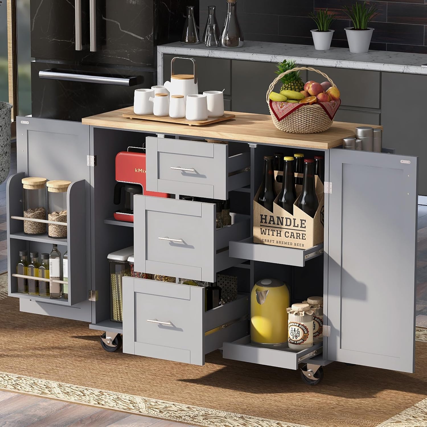 Product Specifications Product Dimension(Overall): W 51.49 x D 17.00 x H 36.85 inches Main Material: MDF Wood Type: Rubberwood Number of Doors: 2 Number of Drawers: 5 Finish Type: Painted Base Type: Changeable Wheels or Feet Product Weight: 109.45LBS Tabletop Weight Capacity: 220LBS Drawer Weight Capacity: 75LBS Estimated Time to Assemble: 40-60 minutes Place of Origin: China Product Care 1. Wipe with a soft dry cloth. Avoid the use of harsh chemicals and household cleaners as they may damage the finish. 2. Hardware may loosen over time; periodically check that all connections are tight.
