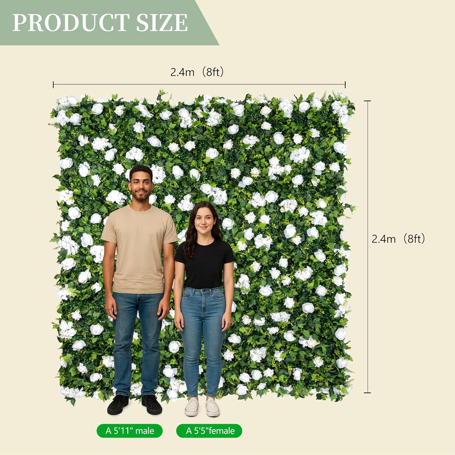 8×8 ft Faux-Grass Wall – 40 sq ft of zero-seam greenery in minutes. Seamless 2-Panel Design – lightweight 4×8 ft sections join with hook-and-loop; zero tools, zero visible seams. Evergreen All Year – hyper-real faux grass; no fading, wilting or shedding, indoors or out. Tool-Free & Reusable – mount, reposition or pack flat in minutes; trim/bend for custom shapes. Zero Maintenance – wipe clean; revive compressed blades with 3-5 min of warm hair-dryer air. Any-Event Backdrop – weddings, showers, retail displays, home accents; wraps pillars or lines aisles for instant photo-ops. Hardware Not Included – panels only; use your own stand or pair with our separate frame.