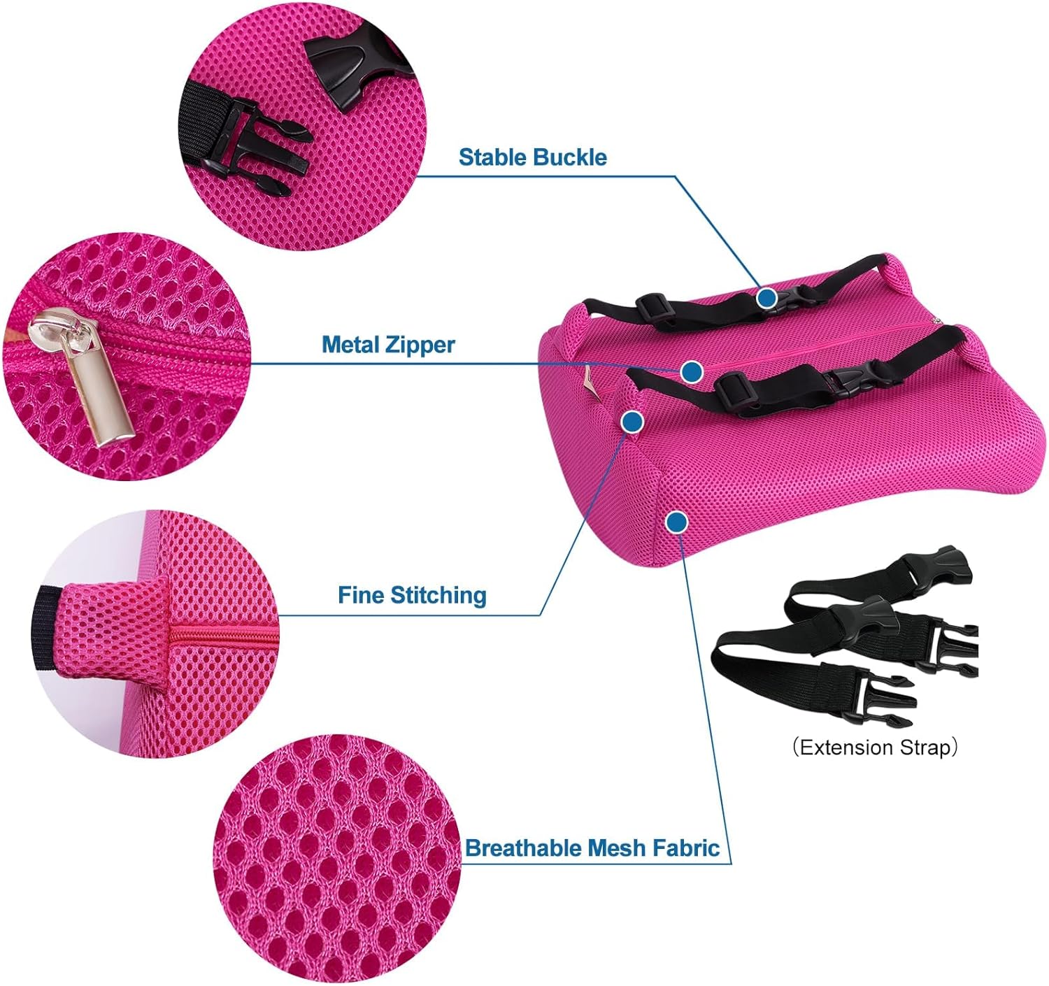 SECURE TWO ADJUSTABLE STRAPS - Lumbar support for car with two adjustable straps keeps the back support cushion in place and prevents the lumbar pillow from sliding down. Two extension straps make the backrest fit on any office chairs, computer chairs, armchairs, sofas, couches, car seats, SUV, trucks, wheelchairs and recliner seats, etc