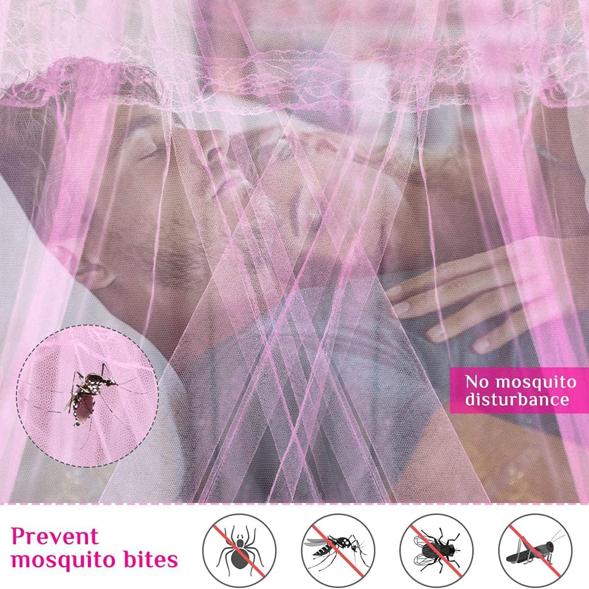 Mosquito Net Bed CanopyMaterial: Polyester + Steel WireDensity: 33-hole meshHeight: 2.6m, Ring Diameter: 0.6 cm, Circumference of Bottom of Net: 11 mPack dimensions: approx. 35cm x 31cm x 7.4 cmTotal weight: approx. 480 gramsSuitable for double beds, single beds and children's beds (width less than 1.6 m)NOTE1.Please allow a little difference in color and size due to manual work.2.The mosquito net is pink and the carry bag is black. Please open the carry bag to confirm the color of the mosquito net.