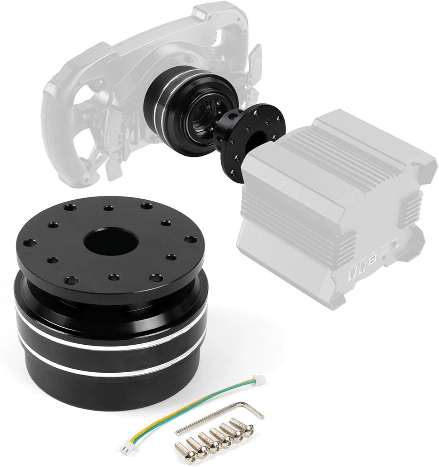 Product Name: racing simulator steering wheel quick release hub Compatibility: R21/R16/R9 V2/R5/R3 Direct Drive Servo Base (Only steering function is supported when using with third party wheels) Material: Aluminum Weight: 0.6kg Hole distance:70mm Features: 1.Euro Truck Simulator Adapter 2.Billet aluminum body. 3.Ball-Lock type mechanism for best locking fit and usability. 4.Fast detach allows steering wheel to be removed quickly. 5.Push-pin security feature prevents premature unlocking. 6.Compatible with 70mm 6-hole steering wheel hub kit. 7.Thickness: 57mm, outer diamter meter: 87mm 8.Fit for MOZA/SIMAGIC etc. WHAT'S INBOX: 1 X Quick-release adapter