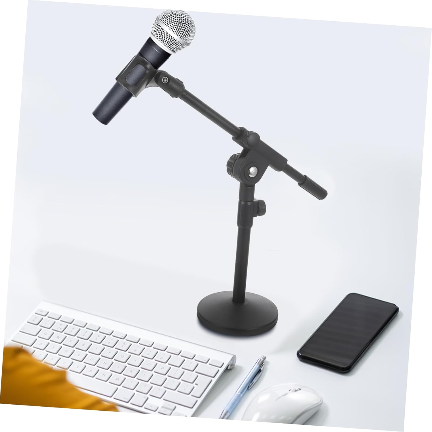 Package Include 1 x desktop mic stand Characteristics -adjustment range:15-27cm desktop microphone stand -Size:44.00X41.00X13.00cm/17.29X16.11X5.11in Adjustable Table Mic Stand -Provides a secure platform for your microphone: ensures that your microphone is stable and secure while in use microphone mount. -Ideal for home studios and live performances: for use in personal recording studios and live performances microphone accessory. -Easy to transport and store: conveniently portable and can be easily stored when not in use microphone arm stand. -Material:Iron Stand for Microphone -Saves space on your desk: helps to up valuable desk space by providing a dedicated stand for your microphone boom mic stand. -Reduces the risk of microphone wobbling or tipping over: minimizes the chances of your microphone shaking or falling over during use mic stand table. -Color:Black microphone supportGoods InformationAdjustable Table Mic Stand This desktop microphone stand is designed to be compact and easy to use, making it for use in a variety of settings.mic stand desk Its small size means that it won't take up too much space on your desk, while its lightweight construction makes it easy to transport and store.streaming accessory Whether you're recording at home or on the go, this stand is the choice for anyone who needs a reliable and portable microphone stand