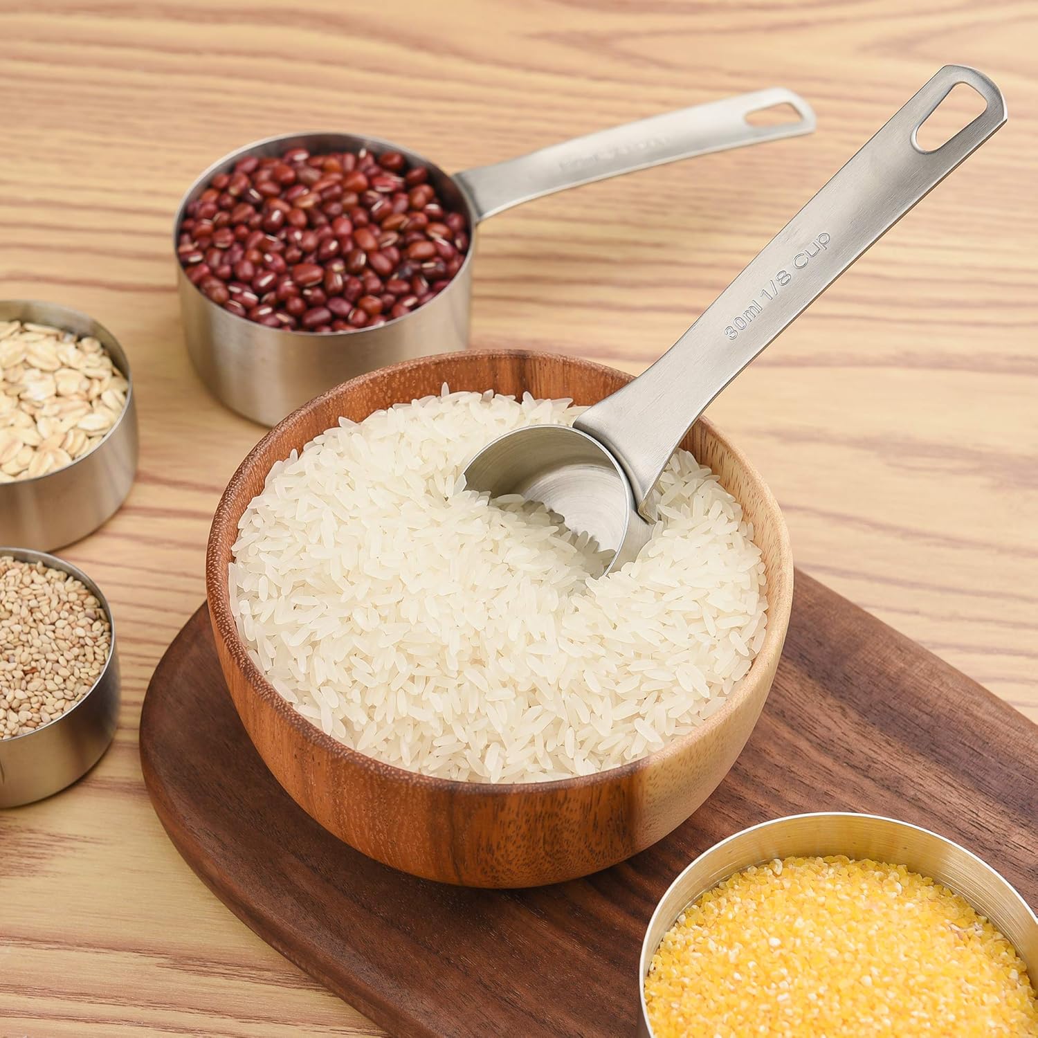 Smithcraft 18/8 stainless steel measuring cups and spoons set:✱✱ 1.Engraved Measurement Markings - do not fade, wash off or wear out like printed ones ✱✱ 2.Materials: FOOD GRADE 18/8 (304) Stainless Steel ✱✱ 3.Round shape to easily stack them into each other for easy storage✱✱ 4.Sturdy Locking Rings to Hold corresponding pieces together✱✱ 7 X MEASURING CUPS:✱✱ 1 cup measuring cup (240 ml) 3/4 cup measuring cup (180 ml)2/3 cup measuring cup (160 ml) 1/2 cup measuring cup (120 ml) 1/3 cup measuring cup (80 ml) 1/4 cup measuring cup (60 ml) 1/8 cup measuring cup (30 ml)✱✱8 X MEASURING SPOONS:✱✱ 4 teaspoon (20ml) 1 tablespoon (15ml) 2/3 tablespoon (10ml) 1/2 tablespoon (7.5ml) 1 teaspoon (5ml) 1/2 teaspoon (2.5ml)1/4 teaspoon (1.25ml)1/8 teaspoon (0.63ml)1 X Measurer Leveler 2 X Locking Rings. Customer Satisfaction: If there is anything that you are not satisfied with our measuring cups and spoons set please contact us freely, we always reply in 24 hrs, and we promise to offer our best services for you.