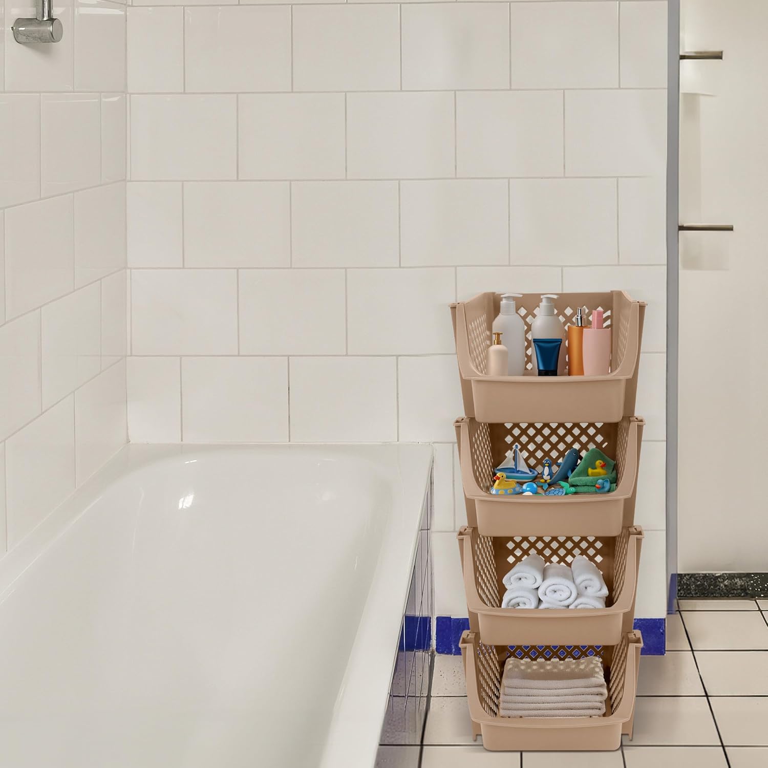 Are your potatoes and onions rolling around the floor of your pantry? Make cleaning and organizing your home easier with the Spec101 Plastic Container Organizer Stackable Pantry Bins. 4 large stacking storage bins sit atop one another allowing you to label and classify each bin for optimal organization. Hold vegetables and fruits in one, snacks in another, and pop bottles or soup cans in the others. Kitchen storage organizer baskets can also help you organize your bathroom, bedrooms, family room, or even the garage or workshop. Durable, plastic construction is lightweight enough that your kids can use them, while the connectable design ensures you can trust these stackable organizer bins to provide a stable, solid storage unit for the whole family to enjoy. Warning: This product can expose you to chemicals which is [are] known to the State of California to cause cancer and birth defects or other reproductive harm.