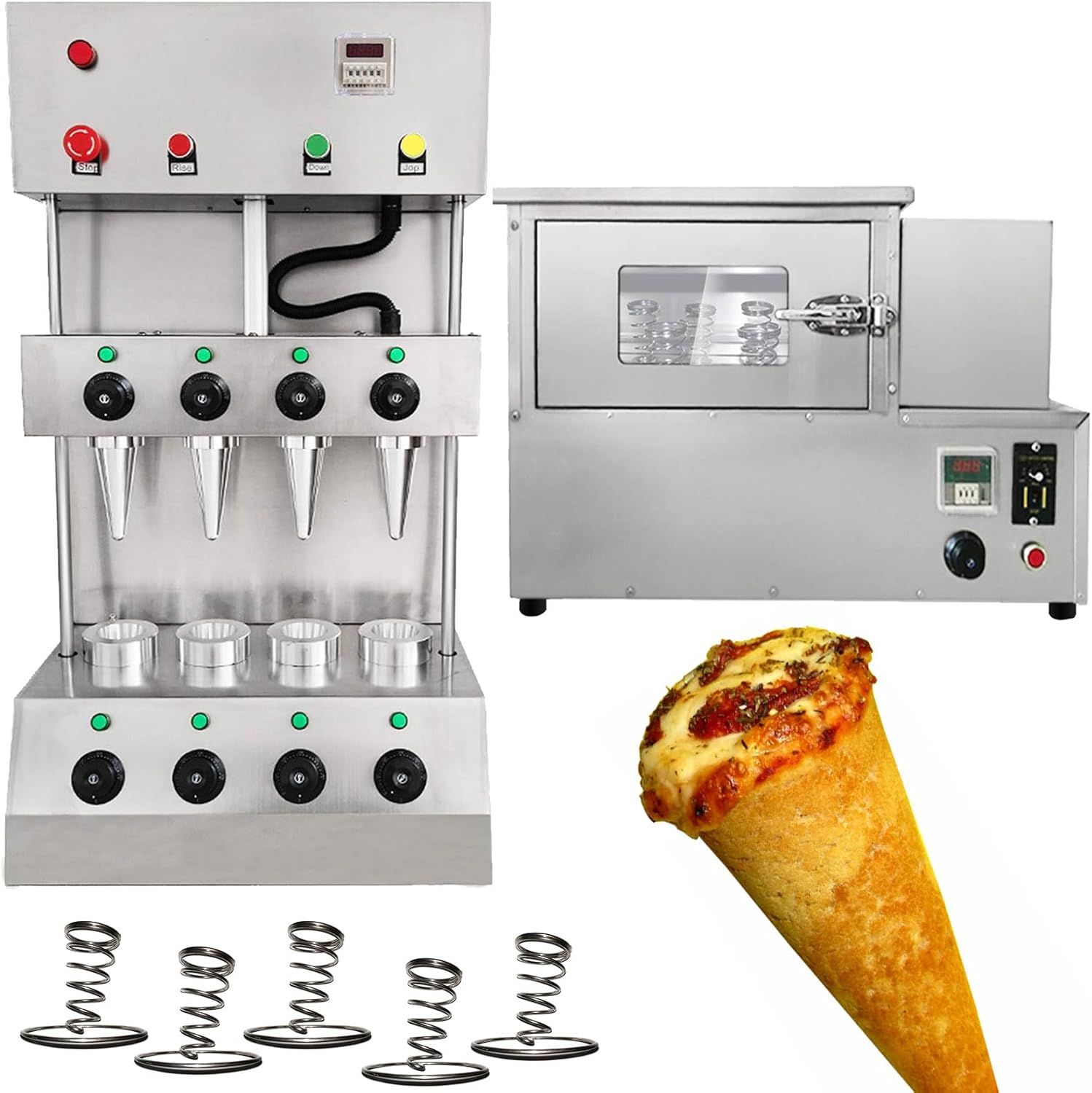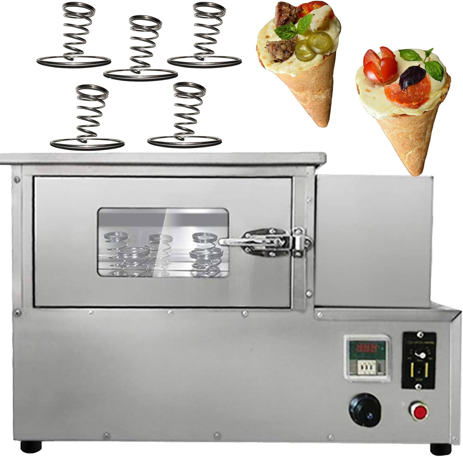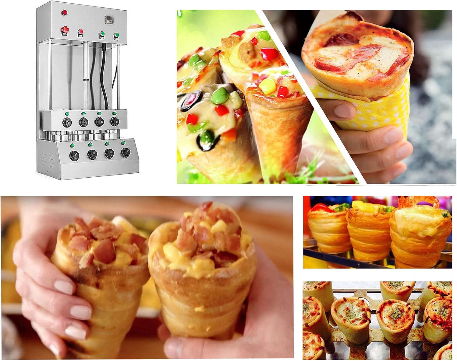 Parameters:This order includes 3 machines(This link includes pizza cone machine pizza oven and pizza display cabinet ) Specification:Model Number: PZ-4 Capacity of Work Bowl (Cup): 1000piece /h The quantity of mold: 4 molds nomal size:5.11*2.36*0.11inch/13*6*0.3CMAccessories: 5pcs pizza cone brackets Voltage: 110V /60HZ or 220V/50HZ Cone machine’s specification: Power: 3000w,Rated current: 27.2A(110V),13.6A(220V) Temperature Range: 0-572℉/0-300℃ Size of pizza machine: 20.86*13.77*38.58inch/530*350*980mm Pizza machine weight: 99.2LB/45kgOven machine’s specification: Power: 2000w,Rated current: 18.1A(110V),9A(220V)Temperature Range: 0-572℉/0-300℃ Size of pizza oven: 32.28*17.32*20.86inch/820*440*530mm Pizza oven weight: 88.18LB/40kg display warmer’s specification: Power: 600w,Rated current: 5.45A(110V),2.7A(220V) Size of display warmer: 20.47*20.47*15.35inch/52*52*39CM display warmer weight: 37.47LB/17kg with 12 holes and lighting Feature:1). The whole body of the machine is made of stainless steel, which is very environmentally friendly.Pizza Cone Machine Main Features1. Could adjust temperature according to different recipe. 2. The heating time of the mold can be controlled according to different dough. 3. The switch can control the production of the cone of the conical pizza.4.Flexible production: adjust the temperature of the top and bottom of the dies according to different pizza formula.5. Indicator reminder: There is an automatic alarm system inside the machine and the power light and the temperature indicator outside the machine. 6.Emergency preparedness: Press the emergency switch and then all the machine will stop working.Rotate Oven Machine Main Features:1. The machine has 4 heating rods, and it takes only 3-5 minute2. Can control the temperature 0-572℉/0-300℃, we recommend to control at 302-356℉/150-180 ° C.